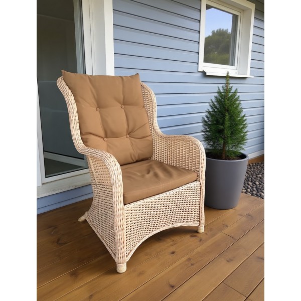 Кресло к комплекту AMARANT в бежевом цвете. Прочный стальной каркас, окрашенный порошковым методом. Нить сфера. Экоротанг высшего качества. Изделие не боится влаги, прямых солнечных лучей, мороза. Температура эксплуатации от -16 до + 50. Легко моется. Не требует особого ухода. Подушки в комплекте. Гарантия 2 года.